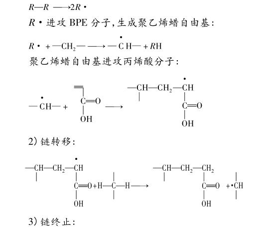 其中,BPE 的接枝改性的反應機理和具體反應過 程如下: 1)鏈引發: 在一定溫度下,引發劑(以 R - R 表示)發生均裂 產生自由基:
