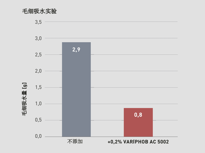 AC 5002 作為粉末狀憎水憎水劑,可在基材固化后表面形成憎水保護,能用于水泥基礦物為原料的干混砂漿體系,阻止材料中毛細管對水的吸收,大大降低基材的吸水率,提高優(yōu)異的憎水性能;可應用在防水砂漿,膩子,填縫劑,裝飾砂漿等場景;