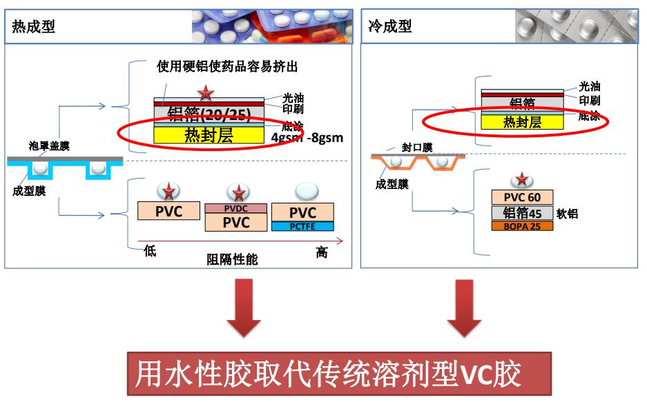 熱封膠產品主要應用在熱封層,分為熱成型和冷成型2種工藝。在熱封層中使用水性膠取代傳統溶劑型VC膠,可以減少VOC排放,提高作業環境。